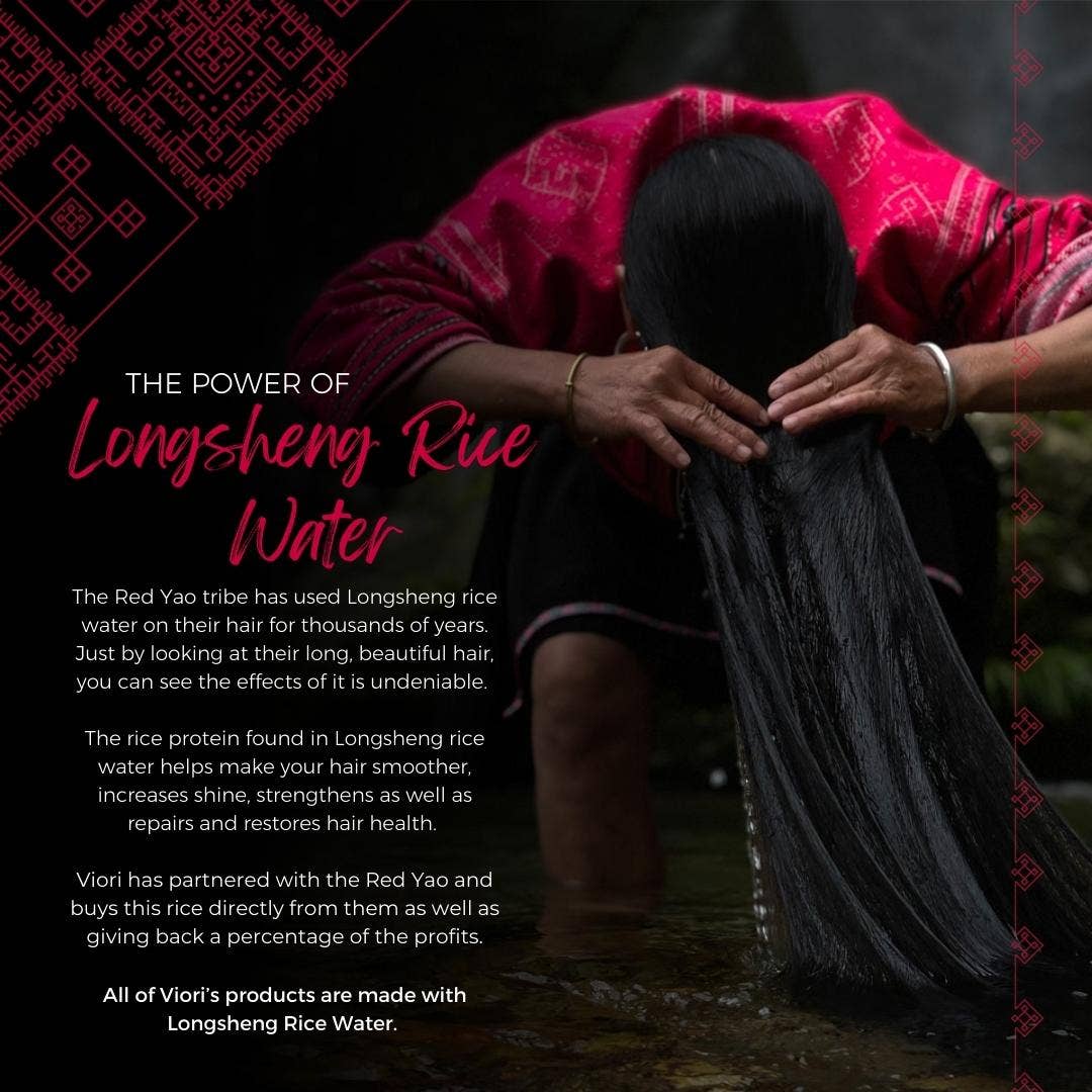 Viori™ Longsheng Rice Water shampoo and conditioner bars are handcrafted with the same rice water the Red Yao tribe has been naturally cultivating high upon the rice-terraced mountains of Longsheng for over 2,000 years. The women of the Red Yao tribe have used this special Longsheng Rice Water on their hair for centuries and in return they all have long, healthy, beautiful hair.